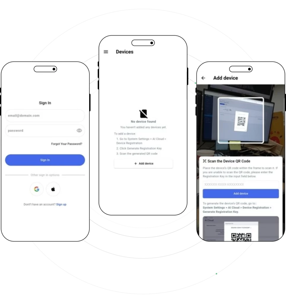 Sieć AI Linked Network obsługuje rejestrację za pośrednictwem kont e-mail, Google lub Apple. Po zalogowaniu się na zarejestrowane konto użytkownicy mogą łatwo zarejestrować urządzenie, skanując jego kod QR, aby rozpocząć monitorowanie.