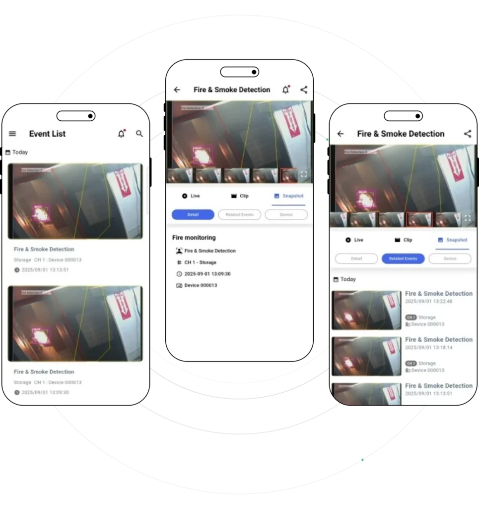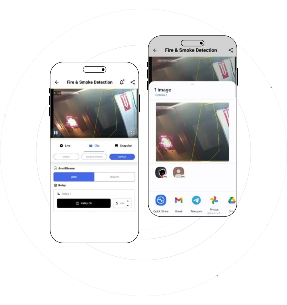 Urządzenia wyjściowe podłączone za pośrednictwem przekaźnika mogą być aktywowane, a obrazy zdarzeń można łatwo udostępniać za pośrednictwem poczty elektronicznej, wiadomości SMS itp.