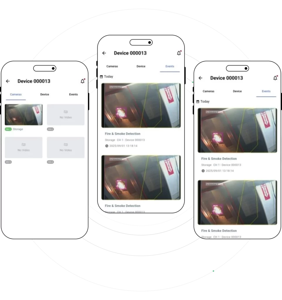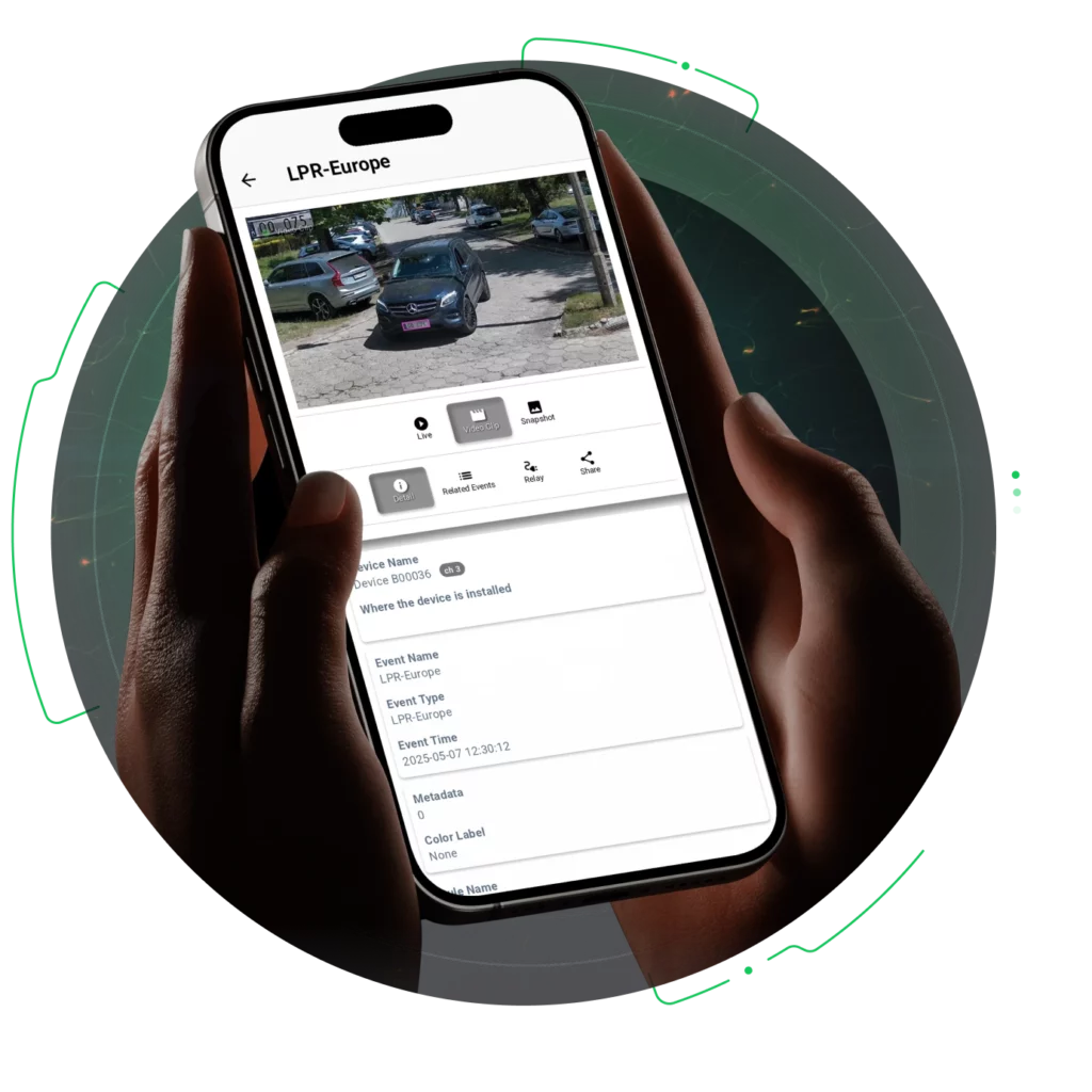 Zarejestrowane urządzenia mają dostęp do monitorowania wideo na żywo, konfiguracji przekaźników i listy zdarzeń.